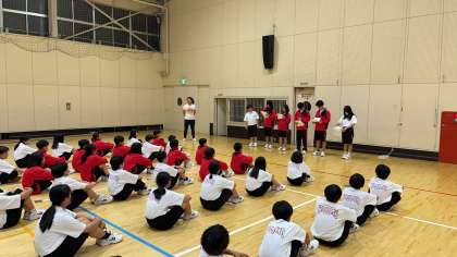 体育委員の説明を聞いています。