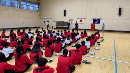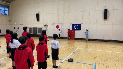 体育館に集合し、朝の集いが始まります。