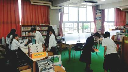 本日の当番には、2年生の図書委員さんがきてくれていました。来館者も2年生の生徒が多く、友人と一緒に本を探したり、読んだりして図書館での時間を過ごしていました。