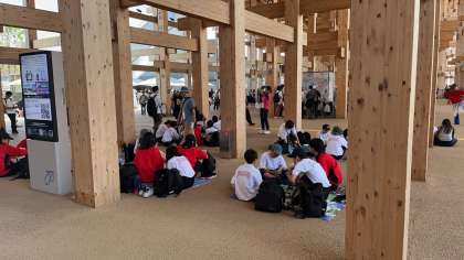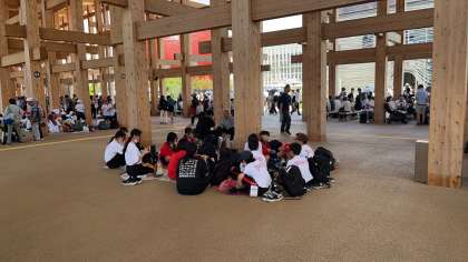 1年生の前半組の生徒がパビリオン見学を終え、大屋根リングの下で昼食を食べました。