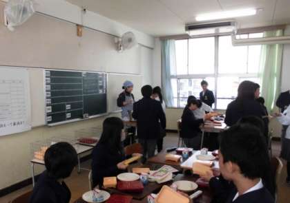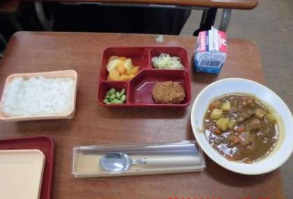 4月11日(月)3学年とも午前中は、オリエンテーション、二測定、視力検査等を実施しました。午後からは、部活動紹介だったので、2、3年生は参加する生徒以外は下校となり、1年生だけが中学校に入って最初の給食を食べました。今日のメニューは、カツカレーライス、キャベツのピクルス、フルーツミックスと牛乳で、たいへん美味しくいただきました。