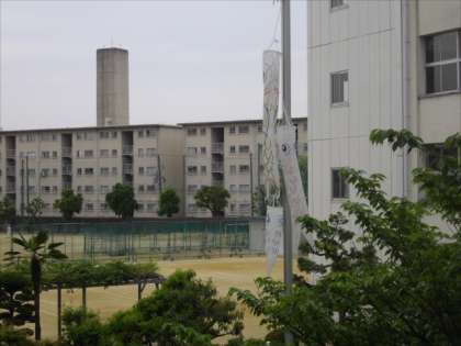 子どもの日を前に、学校の中庭には、本校の管理作業員さんお手製の「こいのぼり」が、みんなを見守ってくれています。