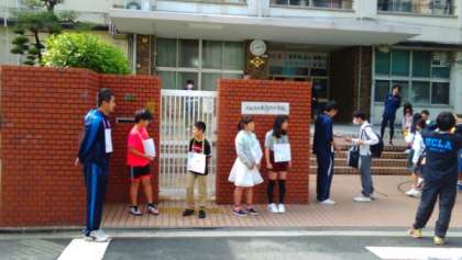 朝の登校時に、井高野中学校の生徒会が井高野小学校と東井高野小学校の門に行き、また両小学校の児童が井高野中学校の門に来て、あいさつ運動を行いました。