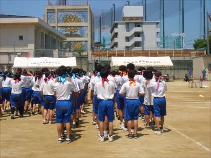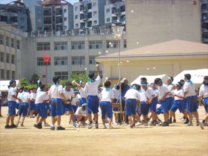 最初に集団行動、ウェーブをしました。声もよく出ています。その後、玉入れです。