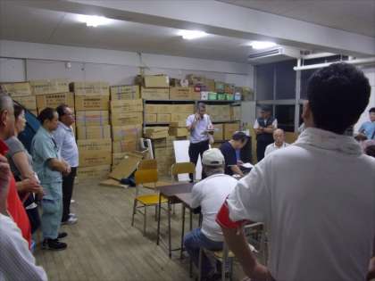 12日(火)の期末懇談も終わり、生徒も下校した夜間に、東井高野地域の夜間水害訓練が行われました。大阪市に大雨洪水警報発令、安威川水系が氾濫レベルに達したとの想定で、東井高野小学校・井高野中学校に避難所を開設するという訓練です。夜間ということなので、学校に教職員はおらず、地域、区役所の人たちだけで本校に避難所開設となります。各町会長さんや女性部長さん、区役所の職員さんたちが、地域のために真剣に訓練をされていました。課題も見つかったようで、熱心に意見交換もされていました。最後に4階の備蓄倉庫で備蓄物資の確認を行い終了となりました。訓練に参加されたみなさん、遅い時間に本当にご苦労様でした。