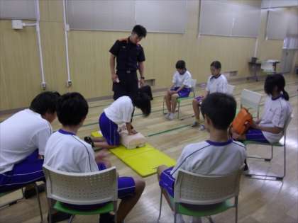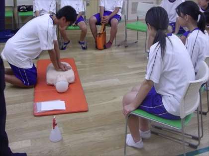 今回受講したのは、保健委員(3年生は希望者)です。後半は人形を使用して実技を行いました。胸骨圧迫は予想以上に体力を使いきつかったですが、真剣に取り組みました。