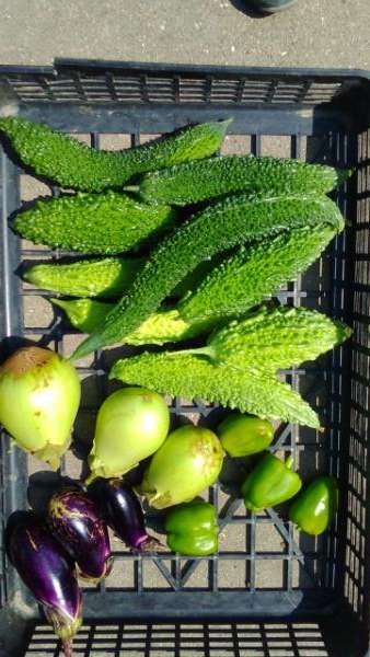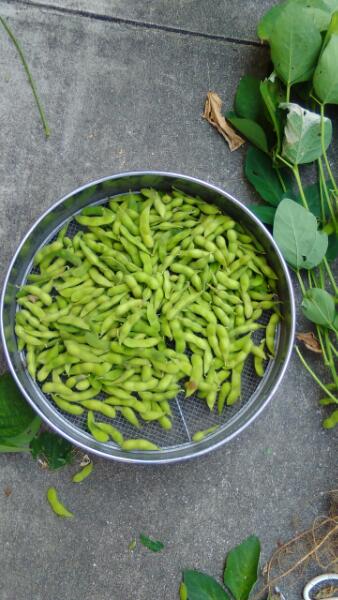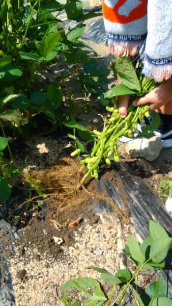 ベジタブル部の活動で野菜が収穫できました。本日の収穫は、枝豆、ゴーヤ、なす、ピーマンです。暑い中ご苦労様です。