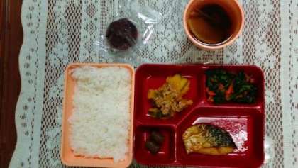 今日の給食は、鯖のみそづけ焼き、かぼちゃのそぼろ煮、ほうれん草とにんじんのおひたし、こんにゃくの甘辛煮、すまし汁、そしてお彼岸ということで おはぎ です。