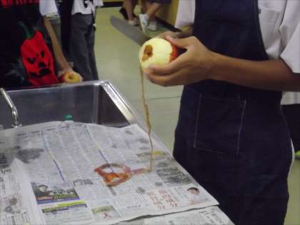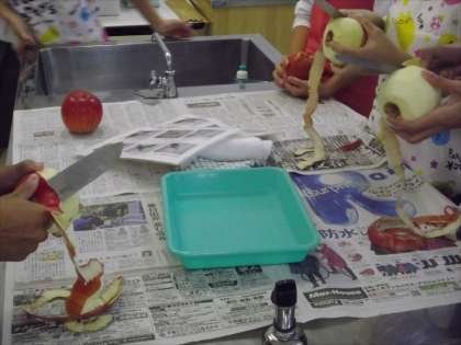 3年生が修学旅行で不在の中、最上級生として学校を守る2年生が頑張っています。1限目には、りんごの皮むきに熱心に取組みました。ボランティアさんにも来ていただき丁寧に教えていただきました。