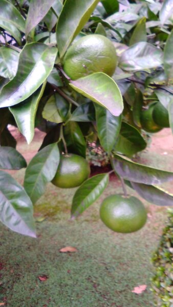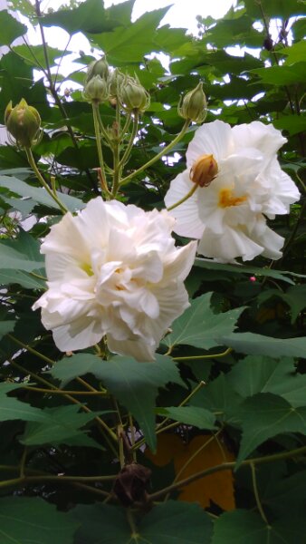 校舎裏には白とピンクの芙蓉の花が咲いています。中庭のみかんの実は大きくなってきました。