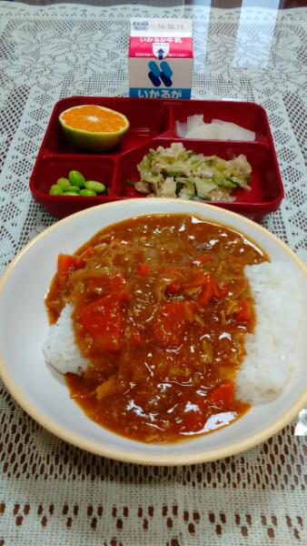 今日の給食は、1.2年生のみです。献立は、ポークハヤシライス、枝豆、鶏肉とキャベツのソテー、だいこんのピクルス、みかんです。