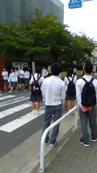朝の登校風景です。体育委員があいさつ運動をしています。また、自主的にゴミ拾いをしている生徒もいます。