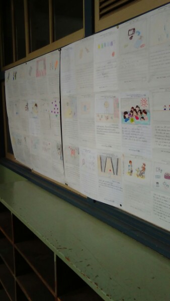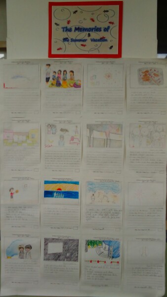 夏休みの思い出を英語で絵日記にしました。2階廊下に掲示しています。