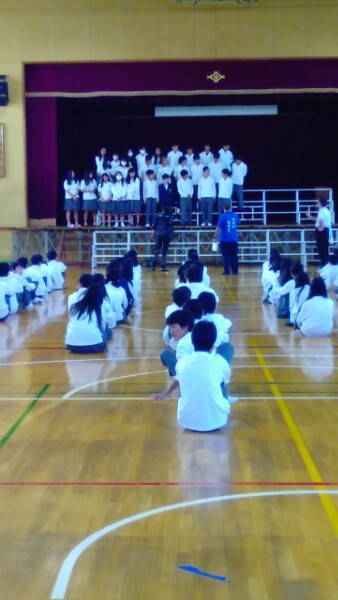 1年生、朝の学年集会の様子です。文化祭に向けての練習です。