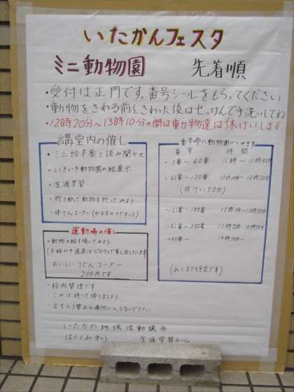 23日(日)いたかの地域活動協議会主催で「ITAKANフェスタ」(〜学ぼう命の大切さ〜)が開催されました。井高野小学校の校庭・講堂で、動物のふれあいコーナー、生涯学習ルームの展示と体験がありました。中学生はあまり来ていませんでしたが、小さい子どもたちが、楽しそうにヒツジやウサギ、ニワトリたちと遊ぶ姿はとてもほのぼのとしていました。