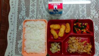 今日の給食は、豚肉ソテーのチリソースかけ、いかのてんぷら、ほうれん草のオイスターソース炒め、はくさいともやしの甘酢あえです。