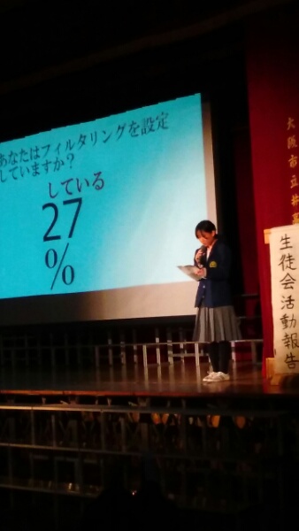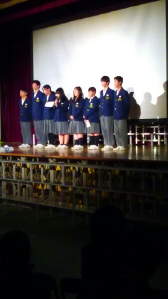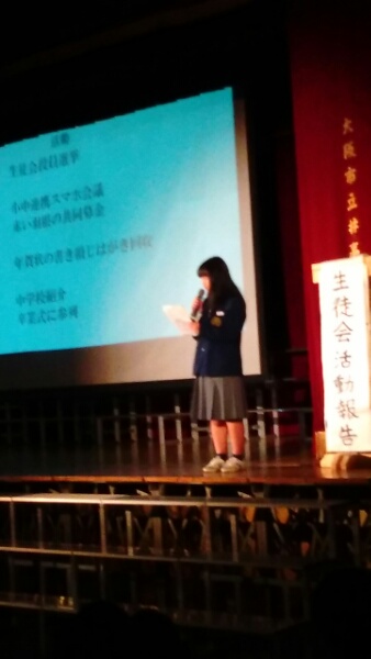 生徒会の発表です。1年間の活動報告、スマホアンケートの結果を発表しました。また、クイズもしてくれました。