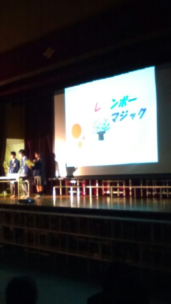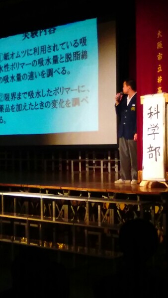 科学部の発表です。吸水性ポリマーの実験や水の色が変わる実験などたくさんの興味深い発表をしてくれました。