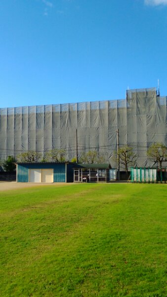 今日は快晴の朝です。東井高野小学校から見た中学校の校舎です。壁面改修工事は、もうしばらく続きます。