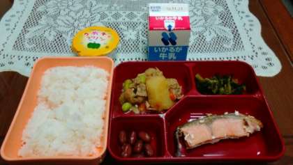 今日の献立は、鮭の塩焼き、豚じゃが、小松菜のおひたし、金時豆の煮もの、かぼちゃのプリンです。