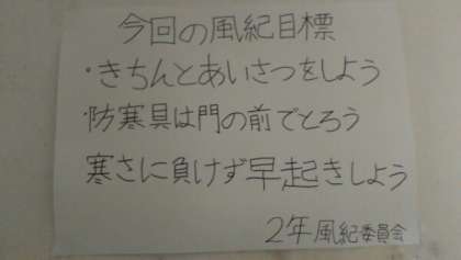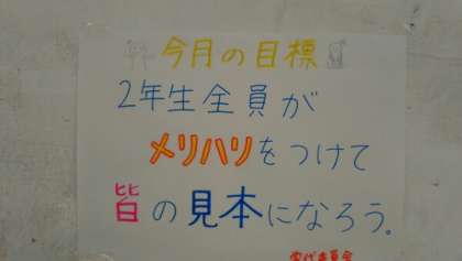 快晴の朝です。2年生の風紀井委員会と学代委員会の掲示物です。目標の達成を目指して頑張りましょう。
