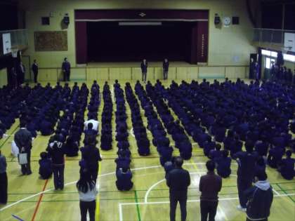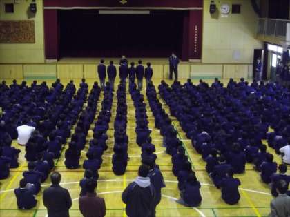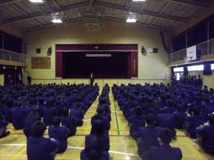 10日(火)3学期の始業式が行われました。校長先生と生活指導部長よりお話がありましたが、しっかりと整列し真剣に話を聞くことができました。年頭にふさわしい緊張感のあるいい雰囲気の式でした。式に先立って、男子ソフトテニス部、保健委員の表彰と年末に行われた男子バレーボール部の全国大会出場者の2人から報告がありました。さあ、いよいよ井高野中学校の平成29年もスタートしました。目標をしっかりたて、がんばっていきましょう!