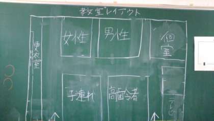 2限目、1年生は自分の卒業した井高野小学校か東井高野小学校へ行き、小学校6年生と一緒に避難所開設の準備を行いました。区役所の職員の方から説明を受けた後、各班、中学生が中心となり避難所のレイアウトを考えました。