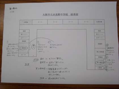 3限目、2年生は「学校ハザードまっぷ」を作成しました。校内でも意外と危険な場所があったりします。班ごとに校内の担当区域を歩き、危険がありそうな場所を話合ってメモしました。それらをまとめて「井高野中学校ハザードまっぷ」の完成です。写真はある班の作成したハザードマップです。