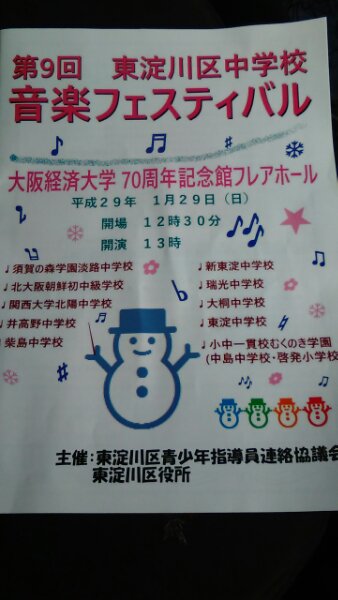 29日(日)に東淀川区音楽フェスティバルが大経大フレアホールで開かれ、吹奏楽部が演奏しました。この催しは青少年指導員連絡協議会が主催して、9回目を迎えました。3曲の演奏予定のところインフルエンザ等の欠席があり、2曲の演奏になりました。しかし日頃からの練習の成果を発揮して、楽しく演奏できました。ご観覧ありがとうございました。