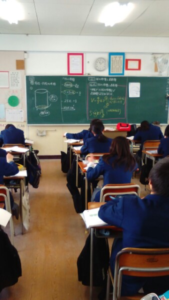1年生の数学の授業です。空間図形の単元で、球の体積と表面積の計算のしかたを学習しています。