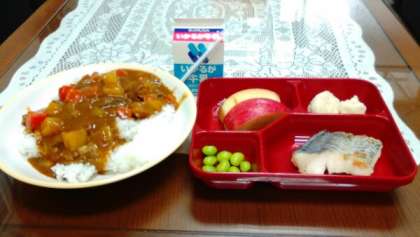 今日の給食は、おろしとんかつ、鶏肉と野菜の煮もの、小松菜のおひたし、のりの佃煮、ぶどうゼリーです。下の写真は、昨日のビーフカレーです。