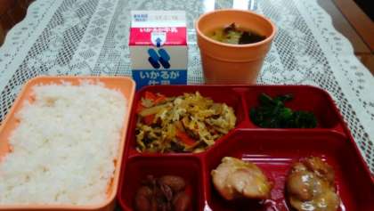 今日は、3年生の多くの人は私立高校の受験です。今までの努力の成果を発揮していることと思います。最後までガンバレと祈っています。1年生は車いすバスケットボールの試合観戦で中央体育館に行っています。そのため給食は2年生のみです。鶏肉のてり焼き、豚肉と干しずいきの炒め煮、ほうれん草のおひたし、うずら豆の煮もの、すまし汁です。