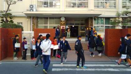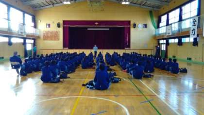 今日は青空が広がっています。寒いですが太陽の光が輝いていて、風もなく空気が澄んでいます。今日も小学生と一緒にあいさつ運動をしています。体育館では、卒業まで1か月をきった3年生が集会をしています。