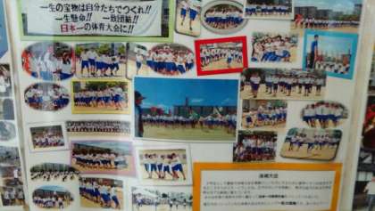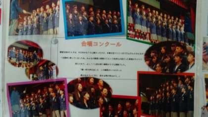 3年生の廊下に行事の思い出の写真が掲示してあります。合唱コンクールと体育大会の写真です。
