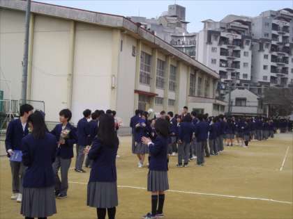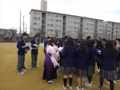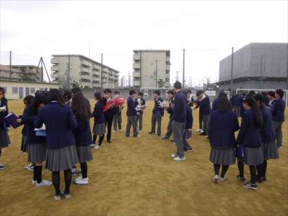 先生や友だちとグラウンドで別れを惜しみました。3年間いろいろなことがありましたが、よく頑張りました。17日(金)に公立一般選抜の合格発表をひかえている人もいますが、みなさんの4月からの活躍を心より祈っています。