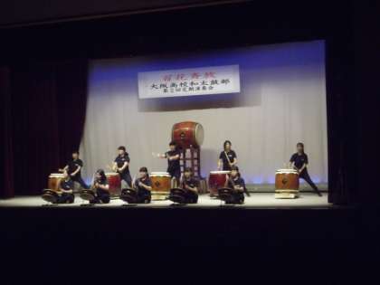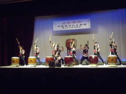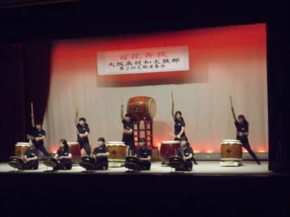 18日(土)本校和太鼓部は、大阪高校和太鼓部の第2回定期演奏会に特別参加させていただき、オープニングで「塊聖(かいせい)」を演奏しました。大阪高校の記念館講堂という大きな会場でたたくことができ、いい経験になりました。本校和太鼓部も頑張りましたが、大阪高校の和太鼓部は、さすが高校生、中学生より力強く素晴らしい演奏でした。大阪高校の顧問の先生、生徒のみなさん、お世話になりありがとうございました。