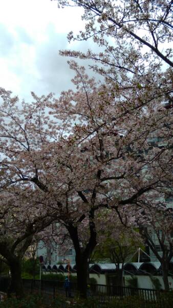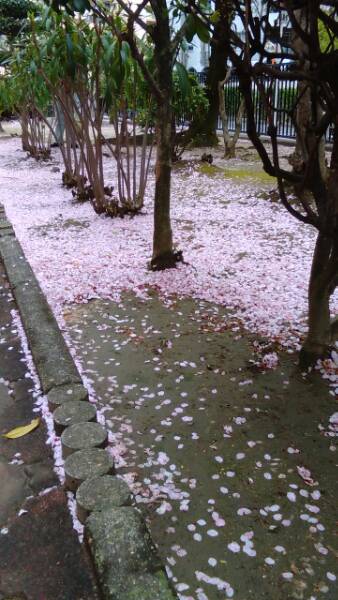 桜が散り始めています。桜の花びらが舞い、地面にいっぱいです。