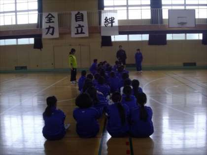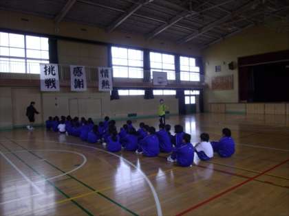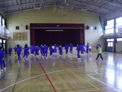 授業初日、1年生は3クラスとも体育館で体育の授業がありました。教科担当の笛の合図で、子どもたちはきびきびと動いていました。一生懸命やっている中に、たくさんの笑顔も見られ、みんなとてもいい表情をしていました。写真は2組の様子です。