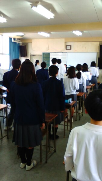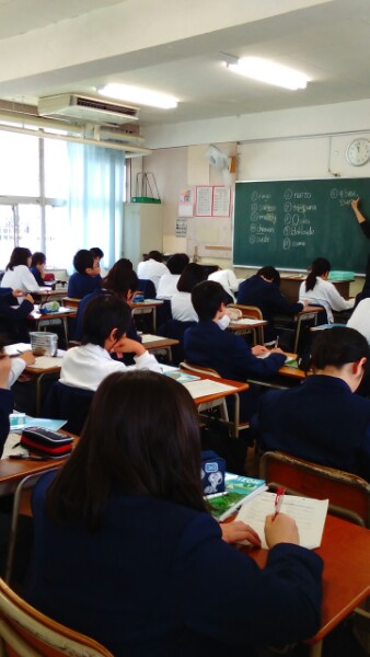 音楽の授業では、校歌を歌っています。体育の授業ではシャトルランの記録をとっています。一番下は、英語の授業です。