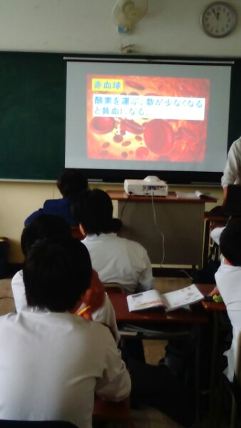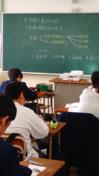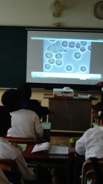 2年生の理科の授業です。「血液の成分やはたらき」について、学習しています。白血球が菌を吸収するところを動画で観察しました。