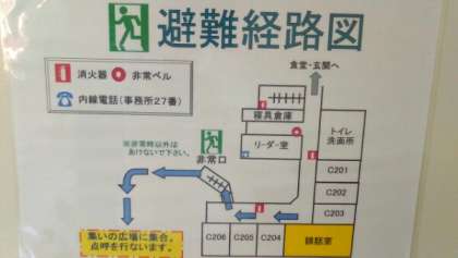 もしもの時のために避難経路も確認OKです。荷物や靴の整理など集団の中でいろいろなことを学んでいきます。