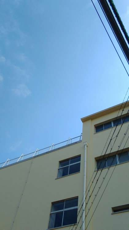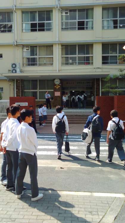 雨が上がり、晴れ間が広がっています。学代委員が正門に立って挨拶の呼びかけをしています。