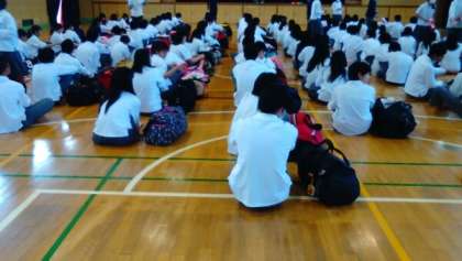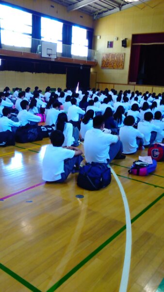 3年生は、明日27日より長崎県へ2泊3日の修学旅行に行きます。今日は荷物を持って登校し、事前準備の集会をしています。明日は6時10分までに学校に集合です。体調を整えて遅れないように集合しましょう。
