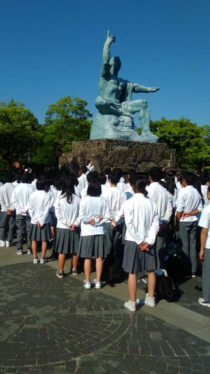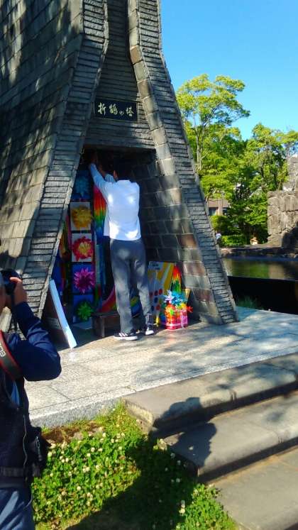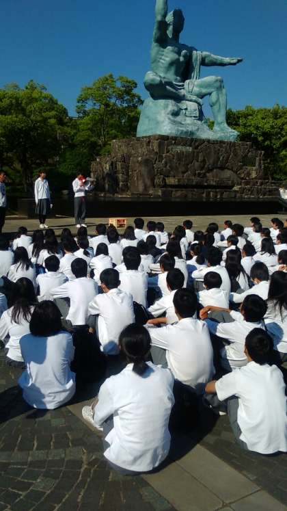 平和祈念像の前で平和の誓い、千羽鶴奉納、平和への願いを込めて[明日へ]の合唱をしました。