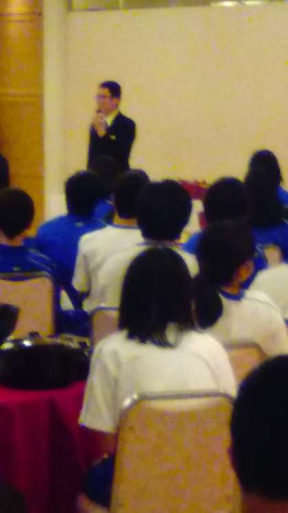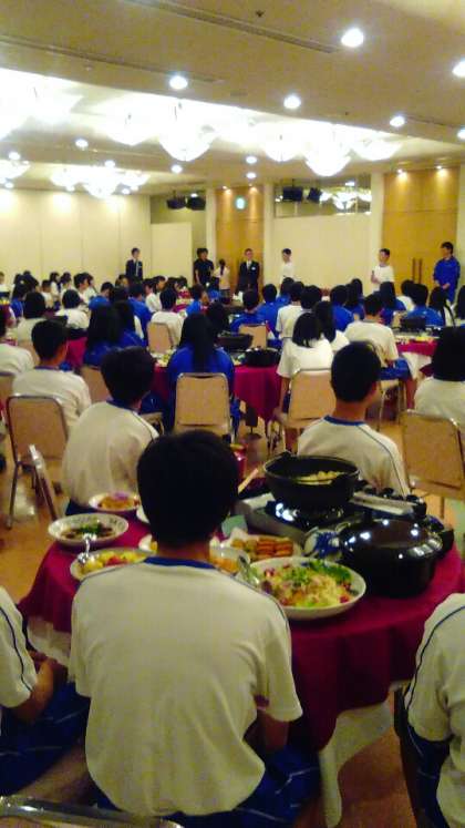 夕食会場で入所式です。生徒代表挨拶の後、ホテルの方から挨拶をいただきました。