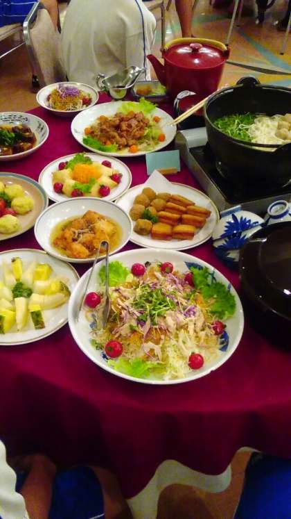 夕食を円卓でいただいています。鍋は五島うどんです。