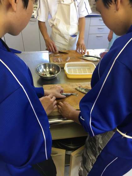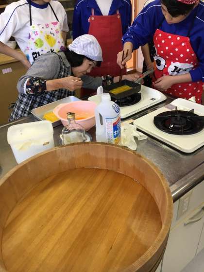 フライ用にアジをさばいています。錦糸卵づくりです。