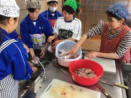カワハギ体験しています。手で簡単に皮をはげるのでカワハギという魚だそうです。慣れない作業に戸惑いながらもがんばっています。