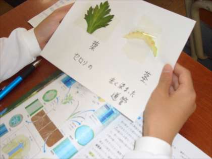 5時間目の1年1組理科の授業は、茎のつくりの観察です。着色した赤い水を吸収したセロリを観察しました。葉の筋や道管が赤く染まっているのがわかります。