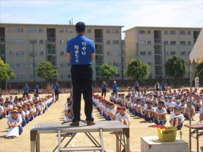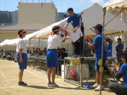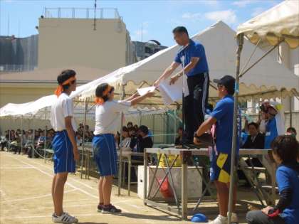 閉会式では、学校長から「井輝勇陽」のスローガン通りよく頑張ったと好評があり、各クラスの代表に賞状・優勝カップが渡されました。その後、PTA会長から各学年1組の体育委員に参加賞が渡されました。[写真の中と下は、3年総合優勝2組の賞状・優勝カップの授与の様子〕